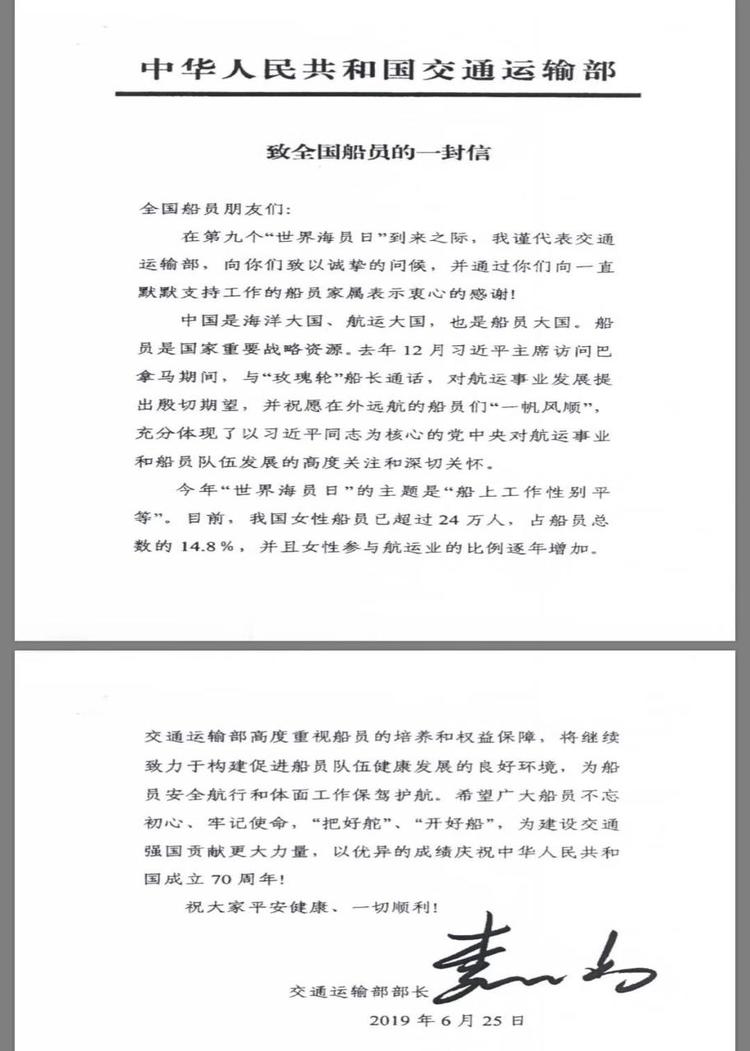 交通運輸部李小鵬部長致全國船員的一封信: