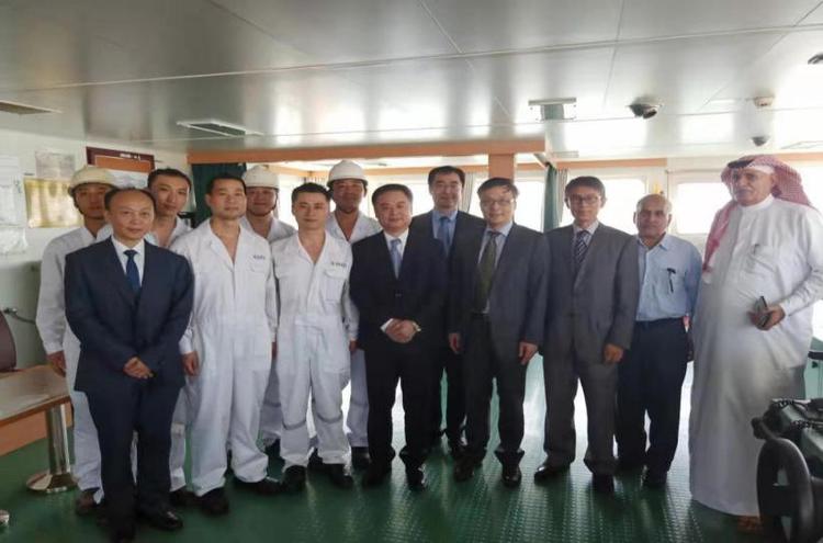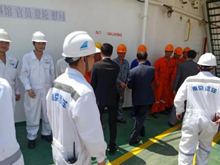 2019年6月25日是第九個“世界海員日”。昨天,中國駐沙特大使館在達曼港對集團南京遠洋“中華門”輪全體中國船員進行慰問,陳偉慶大使及趙參贊等一行7人,于當地時間13點08分登輪,全體船員在何船長帶領下在甲板列隊迎接大使一行并由衷表示感謝。