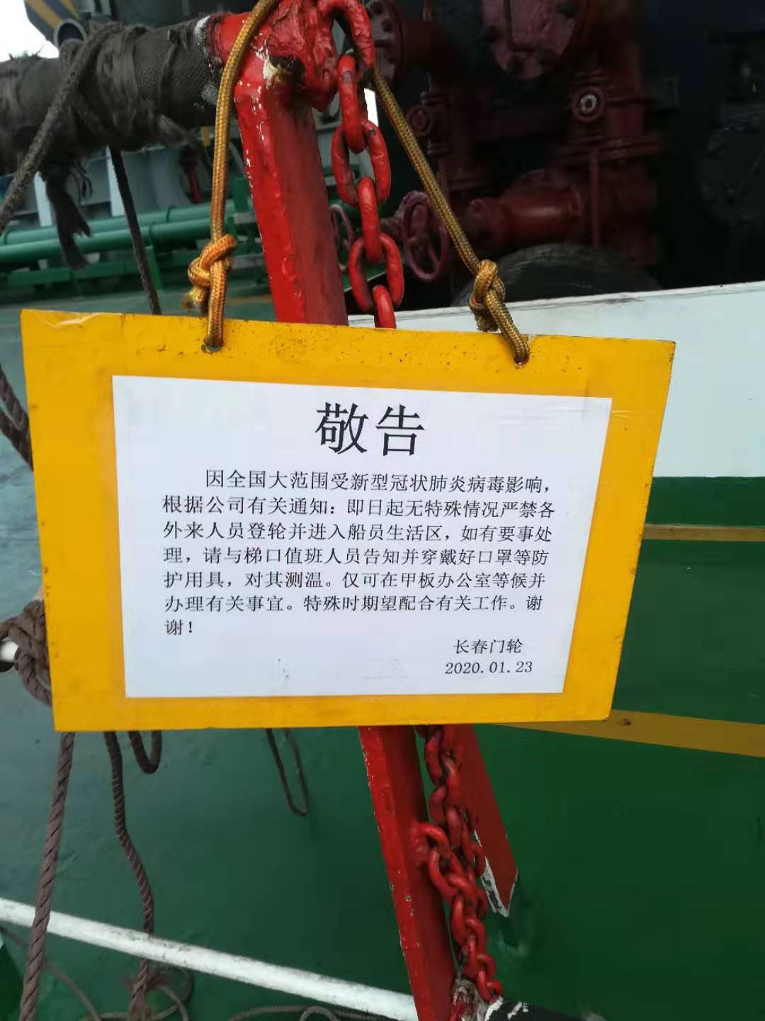4、做好外來人員管控工作。除裝卸貨和生產(chǎn)所需外,外來人員一律禁止登船,經(jīng)營工作地點在指定理貨室或辦公室不得進入船員生活區(qū),同時在船舶梯口張貼告示,做好梯口值班與管控,確保只留一個安全通道。