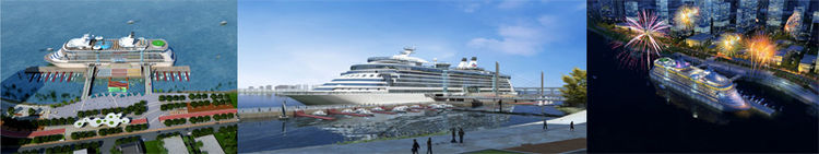 “長江之星”為鋼制躉船碼頭,外形為現(xiàn)代豪華郵輪,長250米、寬40米,主甲板以上高6層,主甲板以下4層,用兩跨棧橋上下,總投資約6億元人民幣,使用長江岸線約300米。